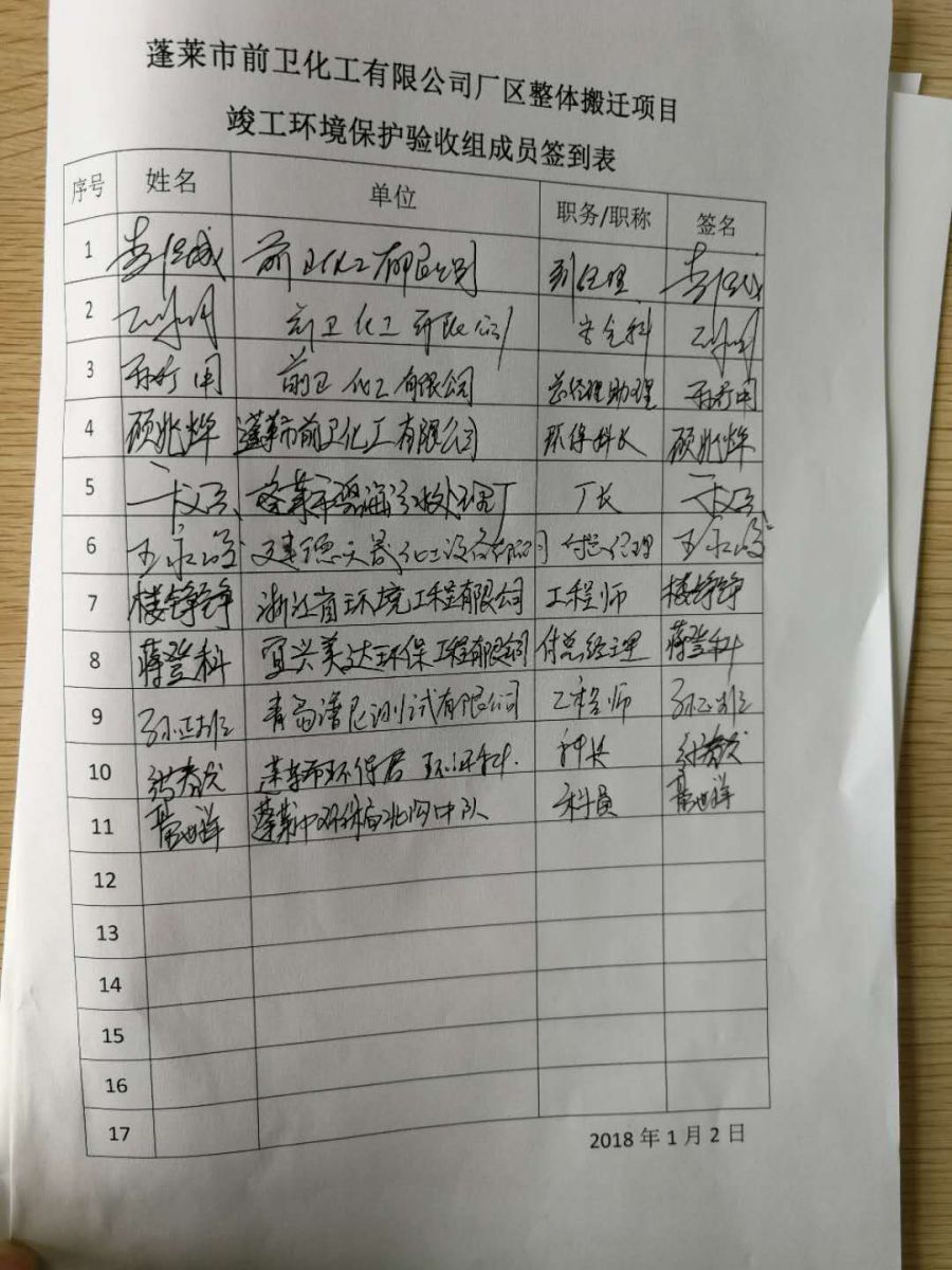 蓬萊市前衛(wèi)化工有限公司廠區(qū)整體搬遷項(xiàng)目竣工環(huán)境保護(hù)驗(yàn)收簽到表